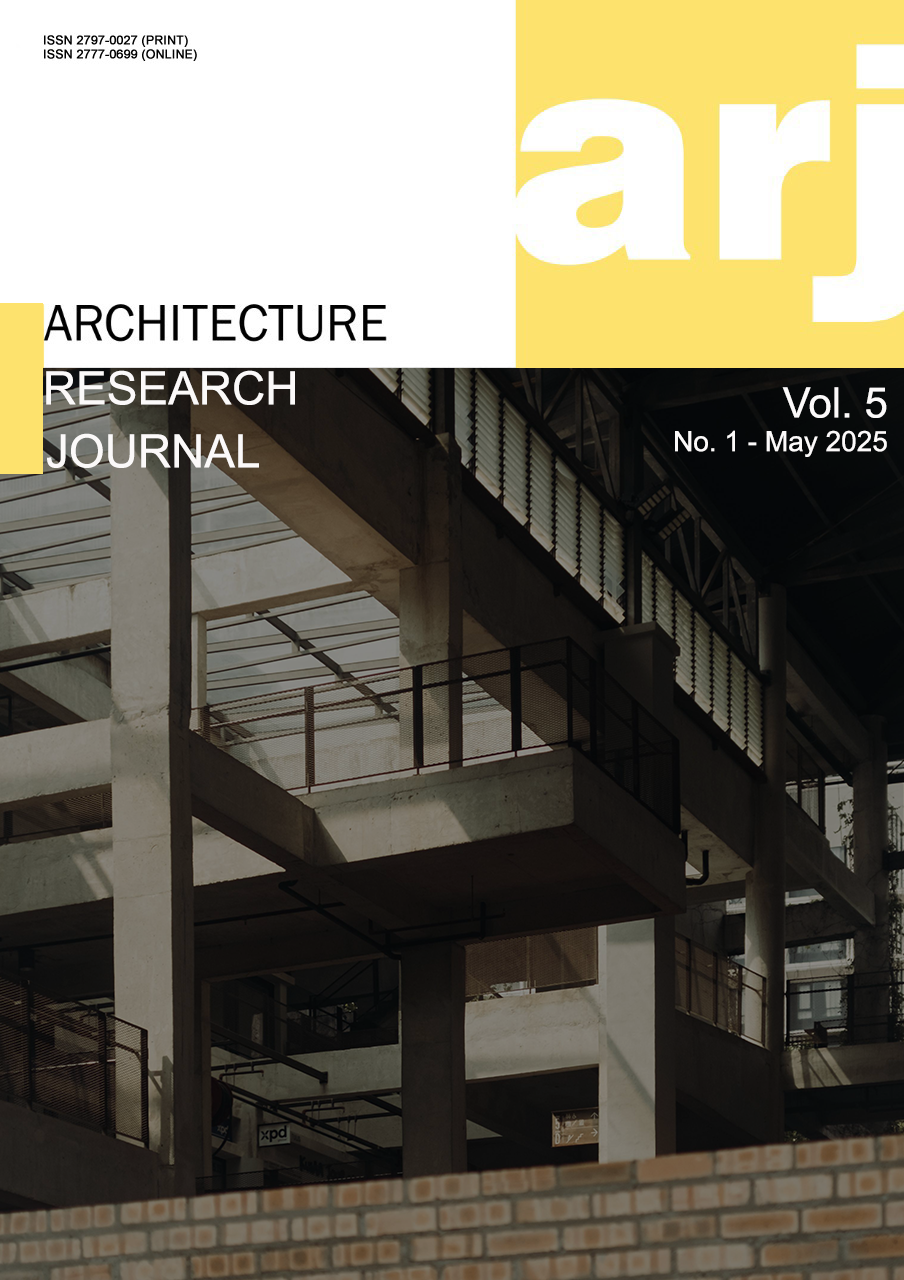 Vol. 5 No. 1 (2025)Architectural Research Journal (ARJ), Volume 5, Issue 1 (2025), brings together a collection of five research articles contributed by scholars from Universitas Muhammadiyah Jakarta, Universitas Widya Mataram, Universitas Faletehan, and Universitas Udayana. This issue reflects the journal’s commitment to advancing critical discourse on architecture through studies that bridge historical heritage, cultural sustainability, contemporary urban design, and inclusive spatial planning.
